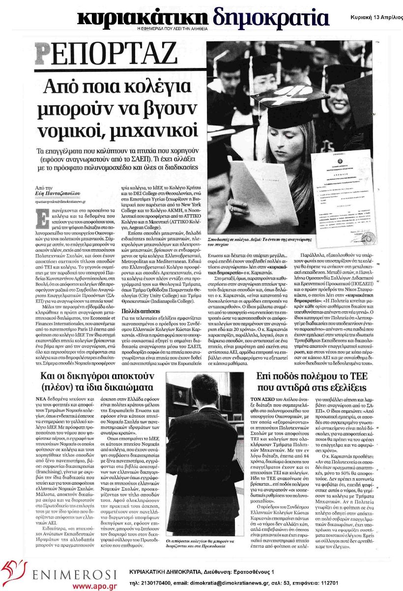 Αρμόδιο όργανο για την χορήγηση της επαγγελματικής ισοδυναμίας των πτυχίων των αποφοίτων των Κολλεγίων με εκείνα των αποφοίτων των ελληνικών ΑΕΙ είναι το Συμβούλιο Αναγνώρισης Επαγγελματικών Προσόντων (ΣΑΕΠ), το οποίο αφού εξετάσει την διάρκεια και το πρόγραμμα σπουδών που έχει παρακολουθήσει κάθε απόφοιτος Κολλεγίου, αποφαίνεται για την χορήγηση της επαγγελματικής ισοδυναμίας με αντίστοιχα Ελληνικού Πανεπιστημίου.